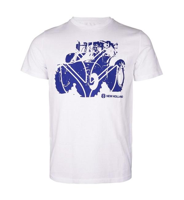 Ce tee shirt New Holland est blanc avec un tracteur de la marque imprimé en bleu.